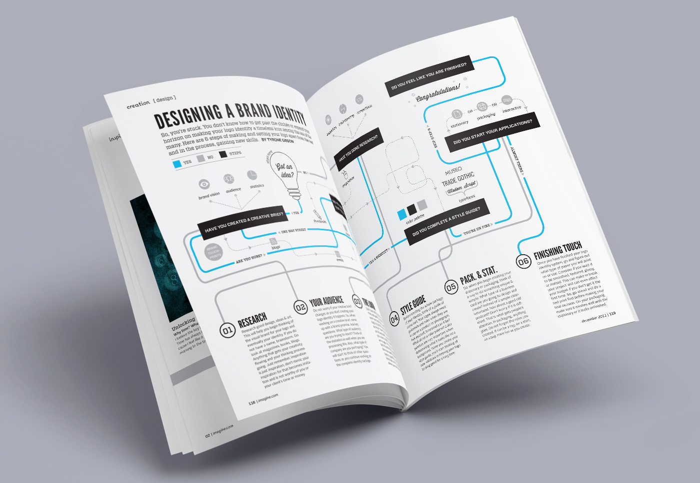 A magazine that is devoted to everything & anything that had to do with the subject of art. I came up with "Imagine" since it conveys creation, inspiration, and vision. I challenged myself by creating a flowchart that associated on the topic of brand identity using graphical icons, facts, and the grid.